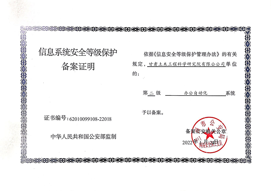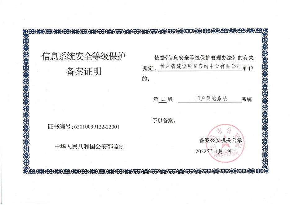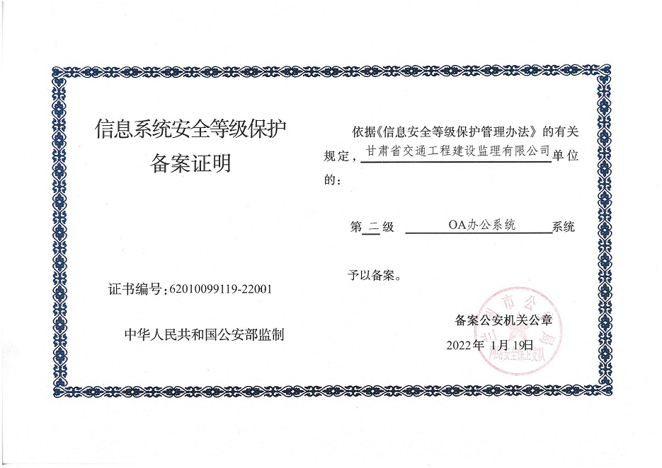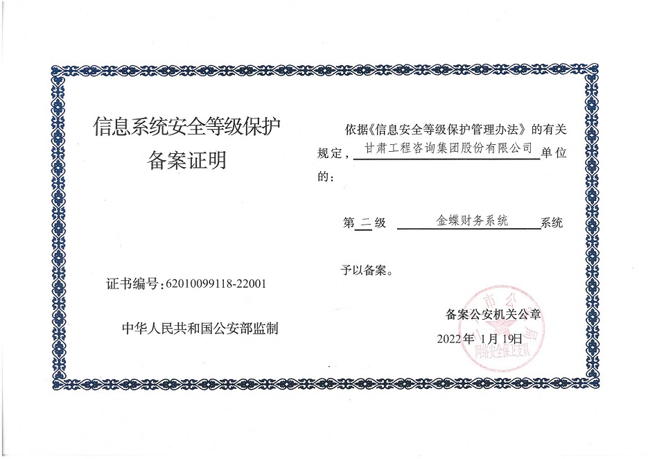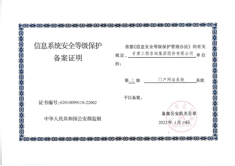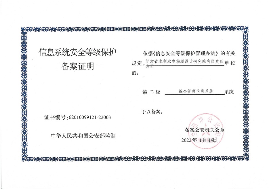 自工作开展以来,相关子公司积极贯彻落实集团公司工作举措,集团本部、建筑设计院、水电设计院、土木工程院、招标咨询集团、交通监理公司合计16个信息系统已顺利完成信息系统安全等级保护2.0测评备案工作,并获得监管部门颁发的《信息系统安全等级保护备案证明》。通过此次等级保护2.0测评工作,集团公司网络和重要的信息数据系统的安全防护和保障能力得到进一步提升,为推动集团公司数字化转型工作打下坚实的基础。