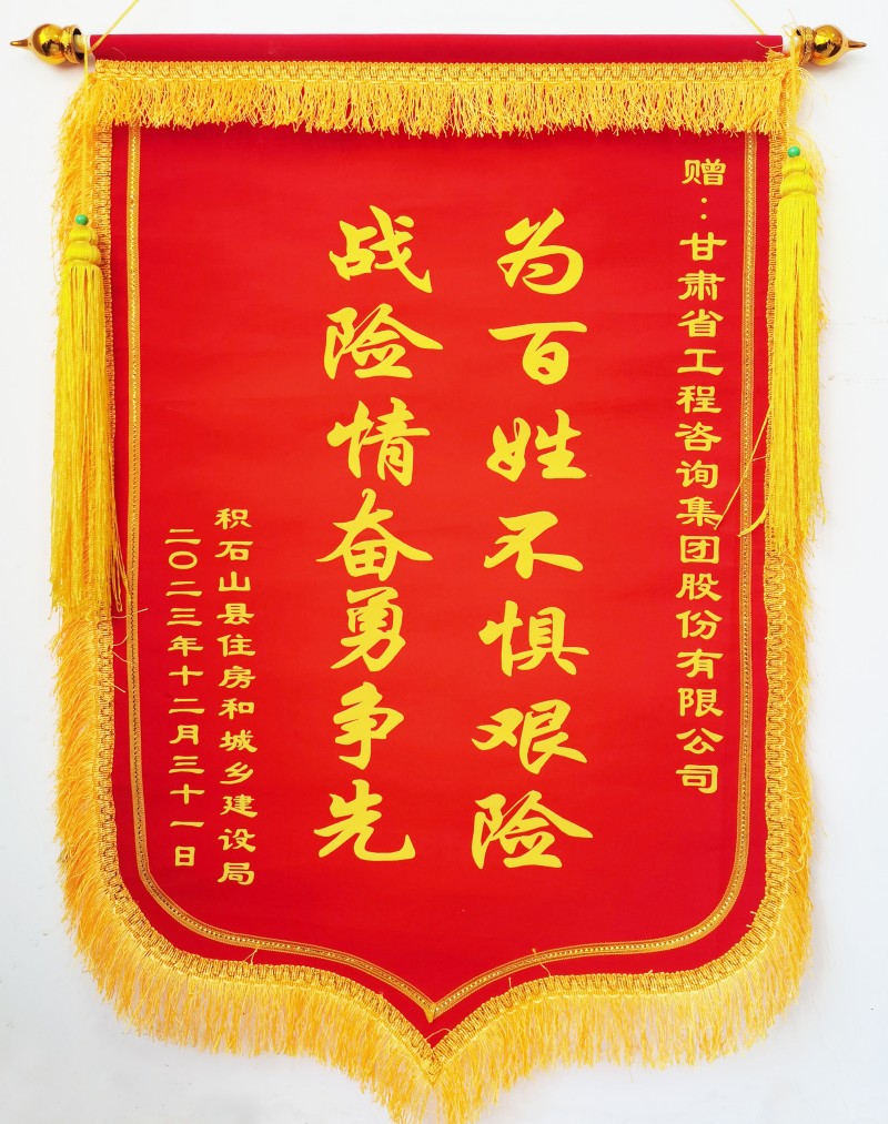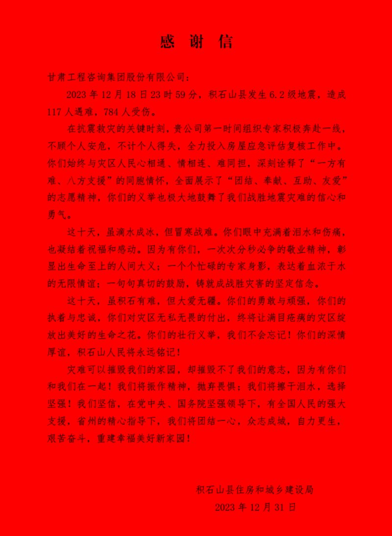 1月3日上午,积石山县住房和城乡建设局向开云app登录入口赠送“为百姓不惧艰险,战险情奋勇争先”锦旗,并发来《感谢信》,对在抗震救灾关键时刻奔赴灾区开展房屋应急评估工作的专家表达感谢和敬意。