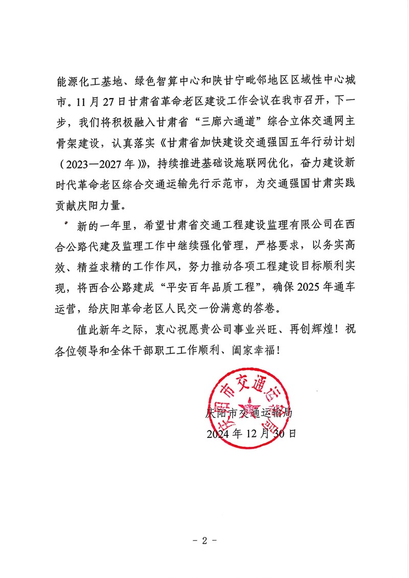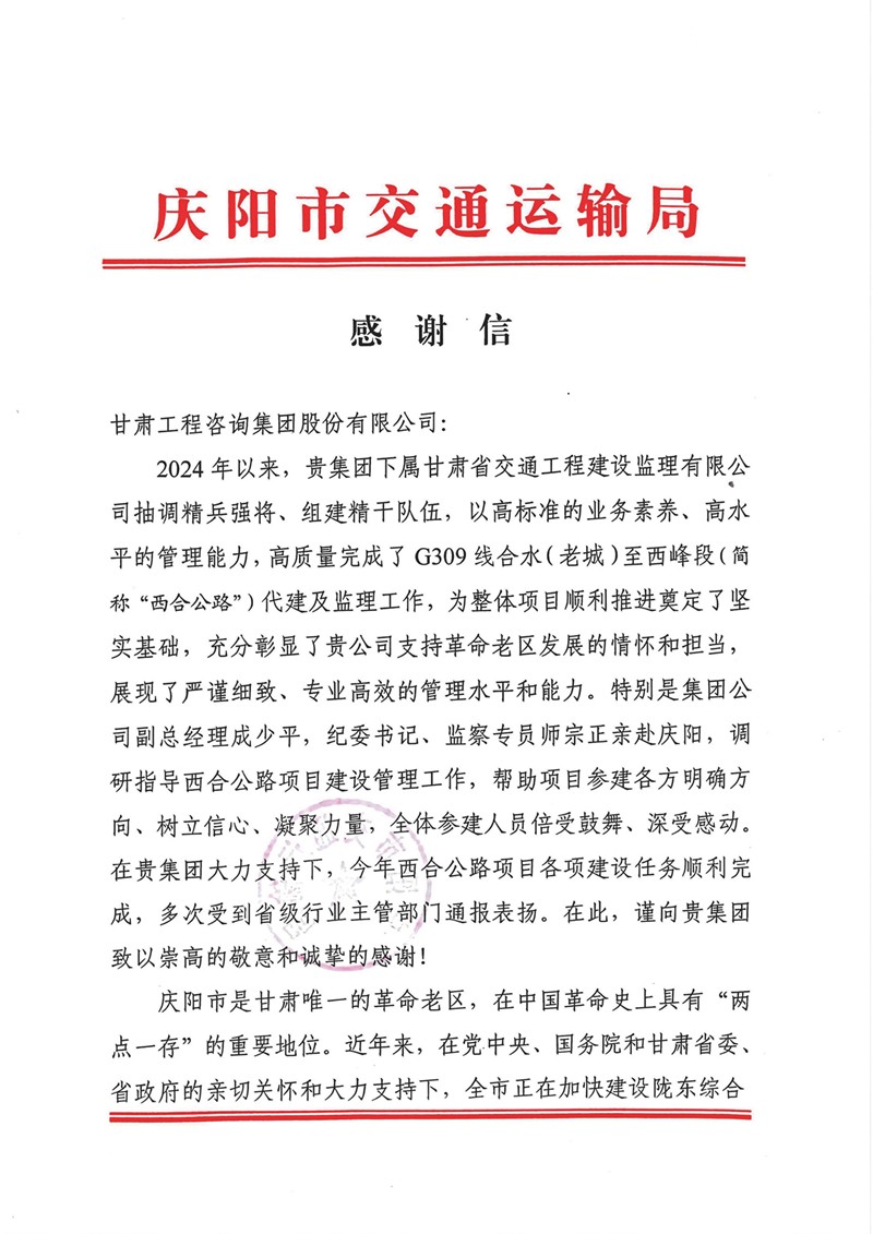 12月30日,开云app登录入口收到庆阳市交通运输局的感谢信,向省交通监理公司在G309线合水(老城)至西峰段公路项目建设过程中作出的贡献表示感谢。
